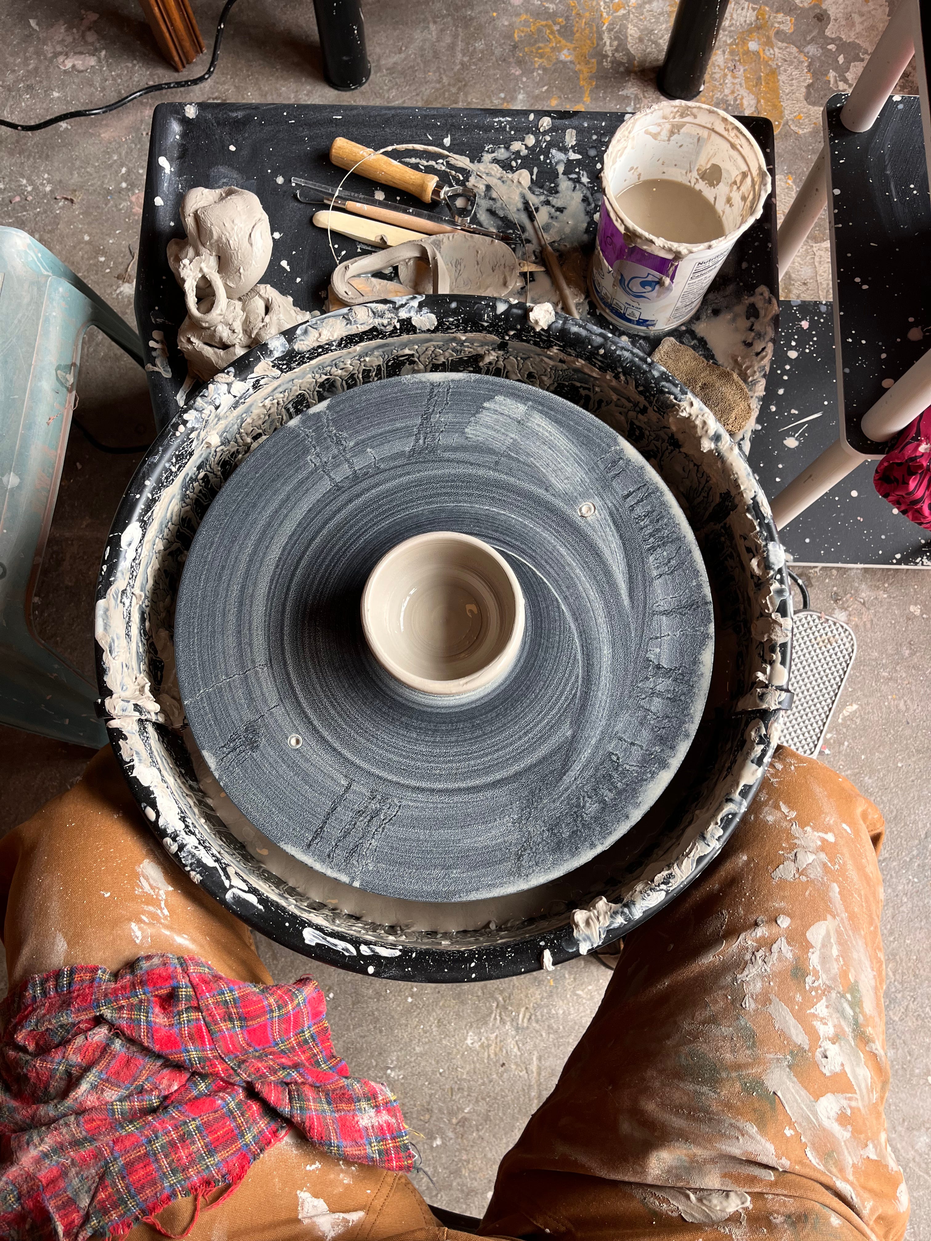 I hear Becca’s voice instructing, “Don’t let the clay throw you around. Strong elbows, strong arms, firm hands.” I do as she says, my body communicating a confidence I definitely do not have yet when it comes to this medium. Cupping the mound of clay with my left hand, the edge of my right palm pushes down on the clay with intention. Before a pot can be opened, the potter must center the clay, bring evenness and consistency to the form. If an uncentered pot is opened, there will come a point in the process of pulling up walls where things start to get wonky — too thick here, not enough clay here, wobbly-lipped pot incoming.