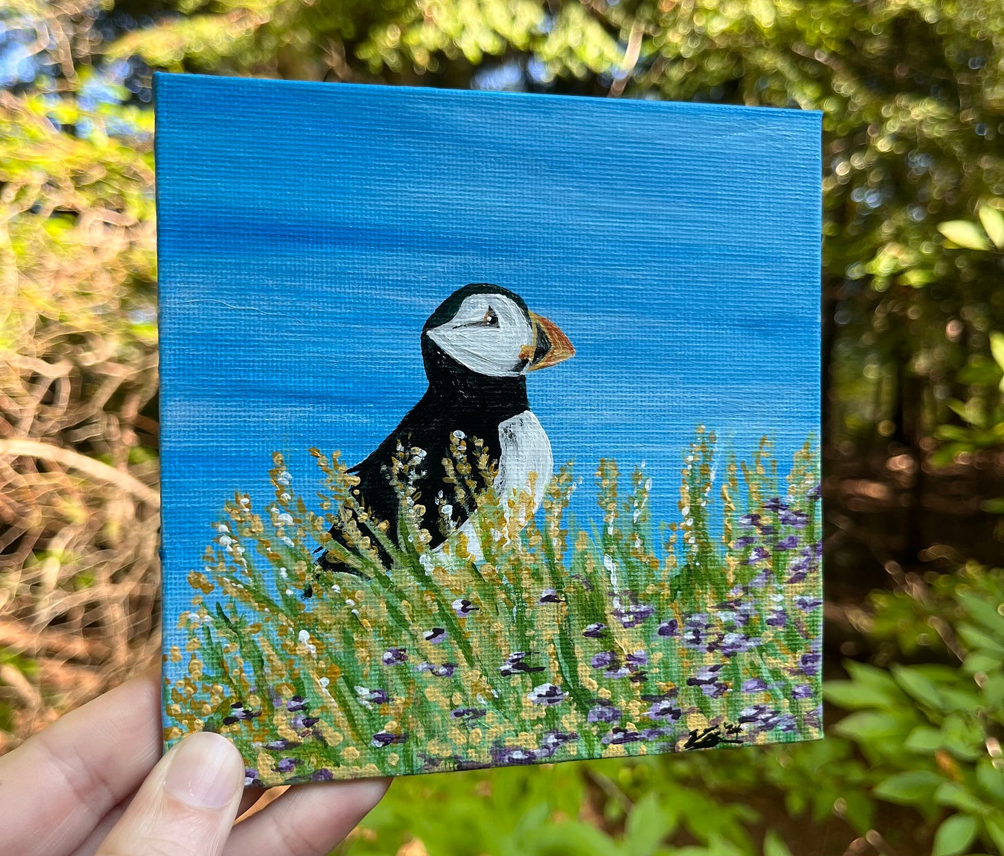 Wood-working guy and I exit the information center and I carry the blank canvas around for the remainder of our date. In an even nerdier turn of events, I start sharing puffin facts with him, walking the very fine line between endearing and eccentric. He listens attentively and comments on how it seems like he’s been missing out on the bird-scene, and Maine might just be the place to dive in. I chuckle at the phrase ‘dive in’, “Wait, did you already know puffins are excellent divers?!”